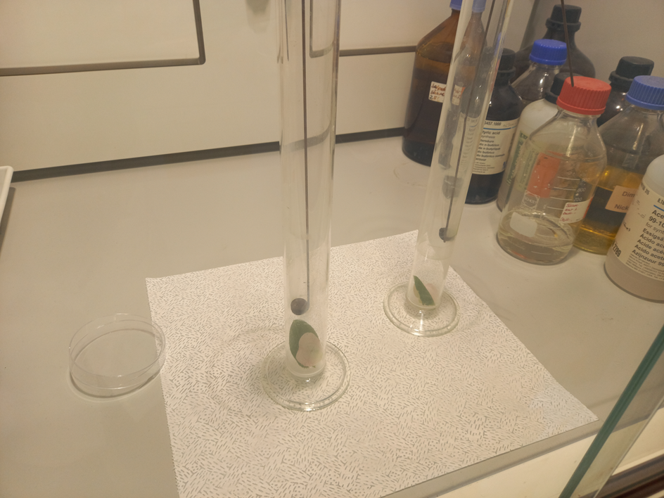 Insgesamt gab es drei Stationen, die alle Schüler*innen in 2er- oder 3er-Gruppen durchliefen. An einer Station wurde die Wirkung von Schwefeldioxid auf die Blattfarbstoffe untersucht. An der zweiten Station wurden die Blattpigmente aus Ahornblättern extrahiert und durch Dünnschichtchromatografie aufgetrennt. An der dritten Station wurde untersucht, in wie weit verschiedenfarbiges Licht die CO2-Aufnahme von Pflanzen verändert.