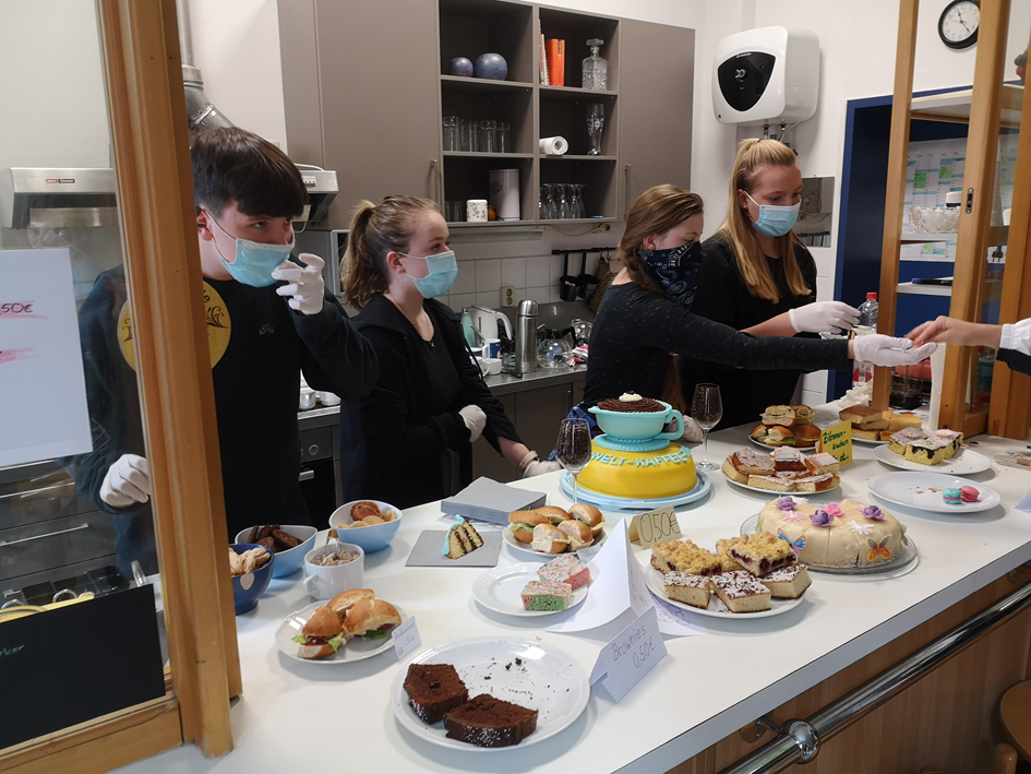 Anlässlich des Weltkaffeetages am 10.10. 2020, hat die Klasse 9a einen Kuchenbasar veranstaltet, bei dem wir fair gehandelten Kaffee und Kakao ausgeschenkt haben. Wir hatten zahlreiche bunte Kuchen gebacken, sodass für jeden Geschmack etwas dabei war. Als Eye-Catcher stellten wir einen Kuchen, der die Form einer riesigen Kaffeetasse hatte und von Frau Waldinger gebacken worden war, in die Mitte des Tresens in der Cafeteria. Vielleicht habt ihr ja sogar ein paar leckere Macarons abbekommen? :) Unsere Schulleiterin war von den tollen Macarons begeistert! Wir haben dank euch ganze 143€ eingenommen!!!!!!! Die 2. Pause lief um einiges besser als die erste. Der Papageienkuchen sowie die Brownies und der Zitronenkuchen waren sehr schnell weg.